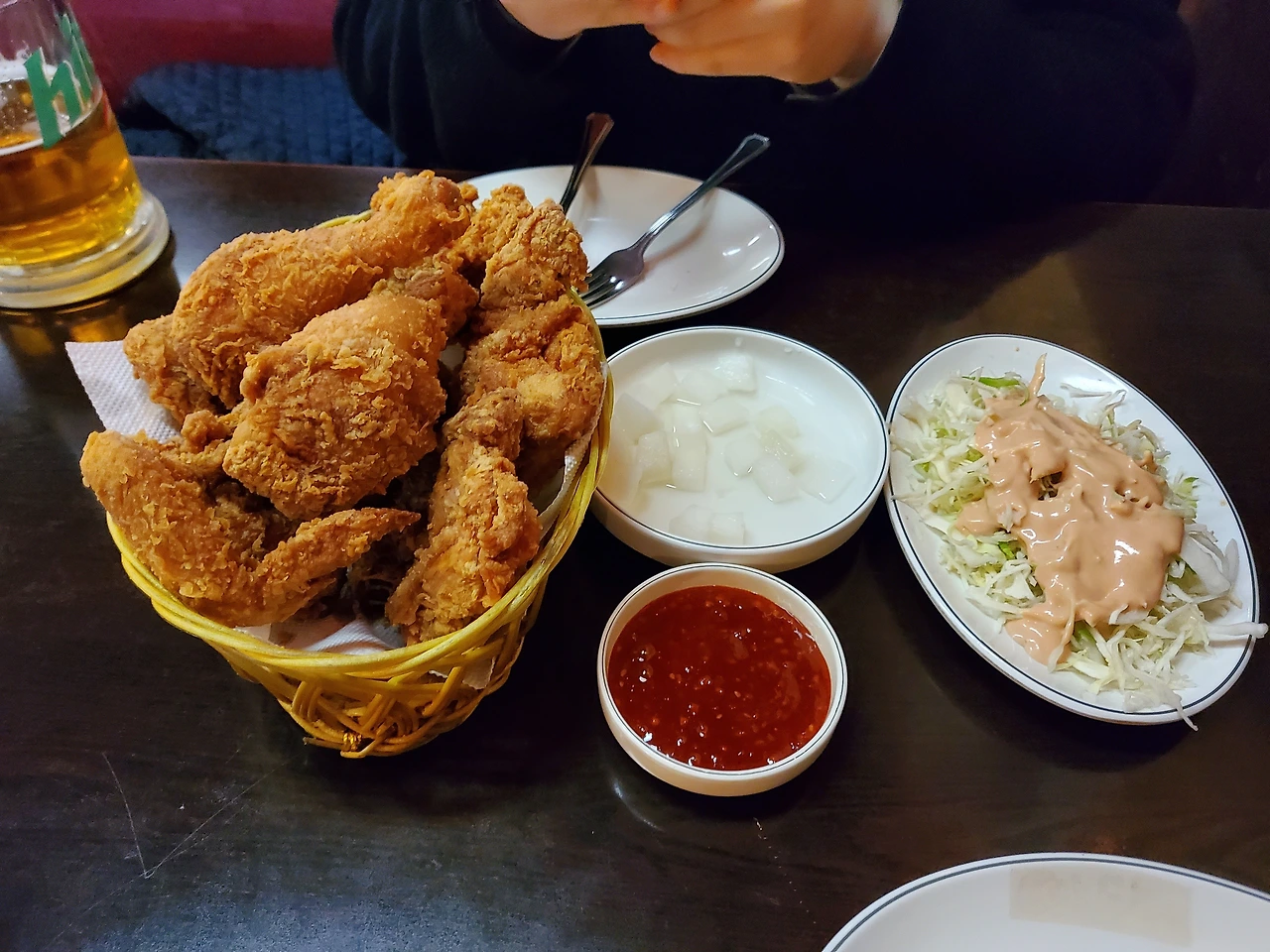 강냉이를 먹으면서 맥주를 2/3 정도 먹었을 때쯤, 치킨이 나온다. 내가 원했던 치킨이 이거였다. 닭다리만 먹어도 배가 부를 것 같은 사이즈, 한 입 베어 물면 짭조름한 육즙이 느껴지는 맛, 사장님이 직접 만든 양념소스와 옛날 샐러드, 그리고 그냥 먹을 때는 맛이 없지만 치킨이랑 먹으면 맛있는 호프. 내가 생각하는 치맥의 정석이다.