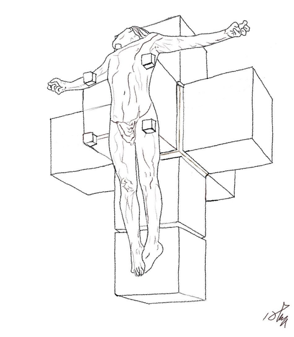 살바도르 달리(Salvador Domingo Felipe Jacinto Dalí i Domènech)의 1954년 그림 〈초입방체의 십자가의 처형 Crucifixión : Corpus hypercubus>은 예수가 십자가에 매달린 모습을 그린다. 이 작품에서 십자가는 테서렉트 다면체 그물의 전개도로 만들어져 있다. 달리의 그림을 스케치적인 선으로 따라 그리면서 각들의 분할점과 선과 면들이 이뤄내는 공간의 변형에 대해 바라본다. 지금부터의 이야기는 우주적이면서 심미적인 도형의 형태적인 고찰에서 비롯된 자연 물리적인 설계구조와 인문 정치사회의 현상분석을 통한 개인적인 의견이며, 다분히 심리적이면서 철학적 상상에서 비롯된 발설이기에 학계의 정립된 가설이나 확정된 사실의 형태는 아니므로, 정밀한 반박의 대상은 아님을 밝혀둔다.