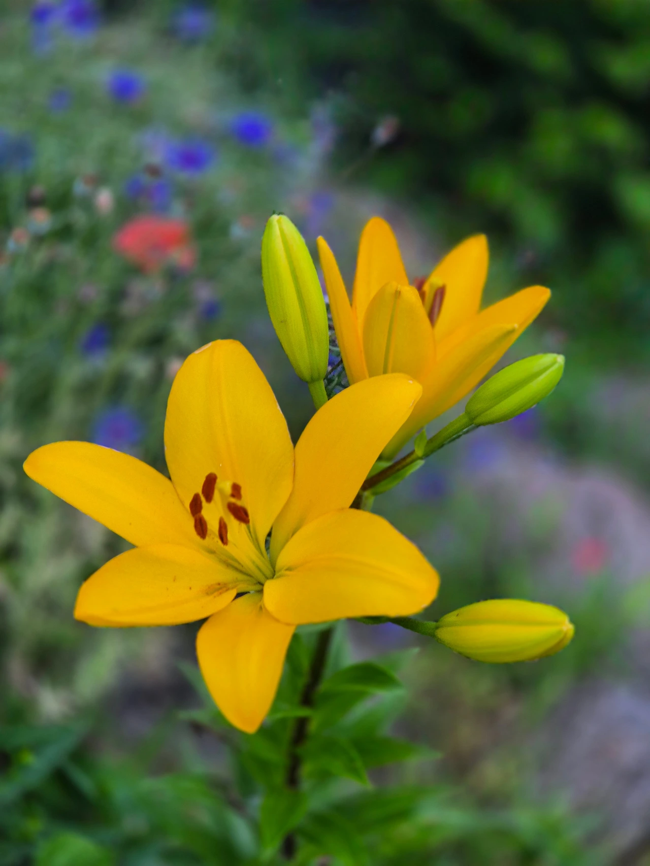 색깔이 어쩜 저리 고울까? 나리꽃들이 여름 꽃밭을 화사하게 수놓고 있다.