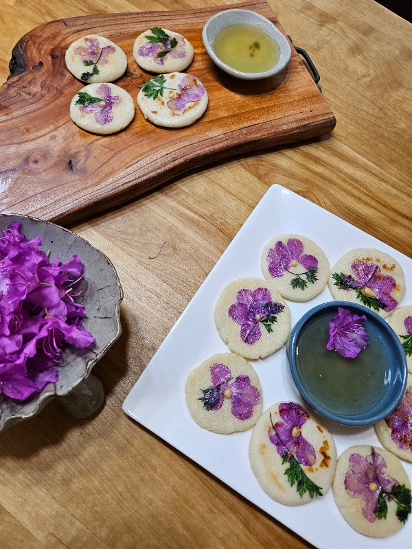 진달래가 살포시 내려앉은 화전이 완성되었다. 그릇장에서 커다란 도자기 접시를 꺼내 화전을 예쁘게 놓고 남은 진달래꽃으로 장식했다. 화전과 꿀, 차를 들고 나와 마당의 나무 그늘에 놓인 테이블로 갔다. 먹기 아까운 모습으로 담겨있는 화전을 물끄러미 바라만 보다가, 그래도 먹자며 꿀에 찍어 입에 넣었다. 단짠단짠의 자극적인 조화나 코를 찌르는 향기는 없지만 찹쌀의 고소함과 꿀의 단맛이 어우러지며 입안에 은은하게 퍼졌다. 맛에도 품위가 있다면 이런 맛일 거라는 생각이 들었다. 시각이 곧 미각, 보기 좋은 떡이 먹기도 좋다고 하지 않았던가? 어쩌면 화려하게 장식된 화전을 보면서 입에서 맛을 느끼기도 전에 나는 이미 맛있다고 정해버렸을지도 모른다.