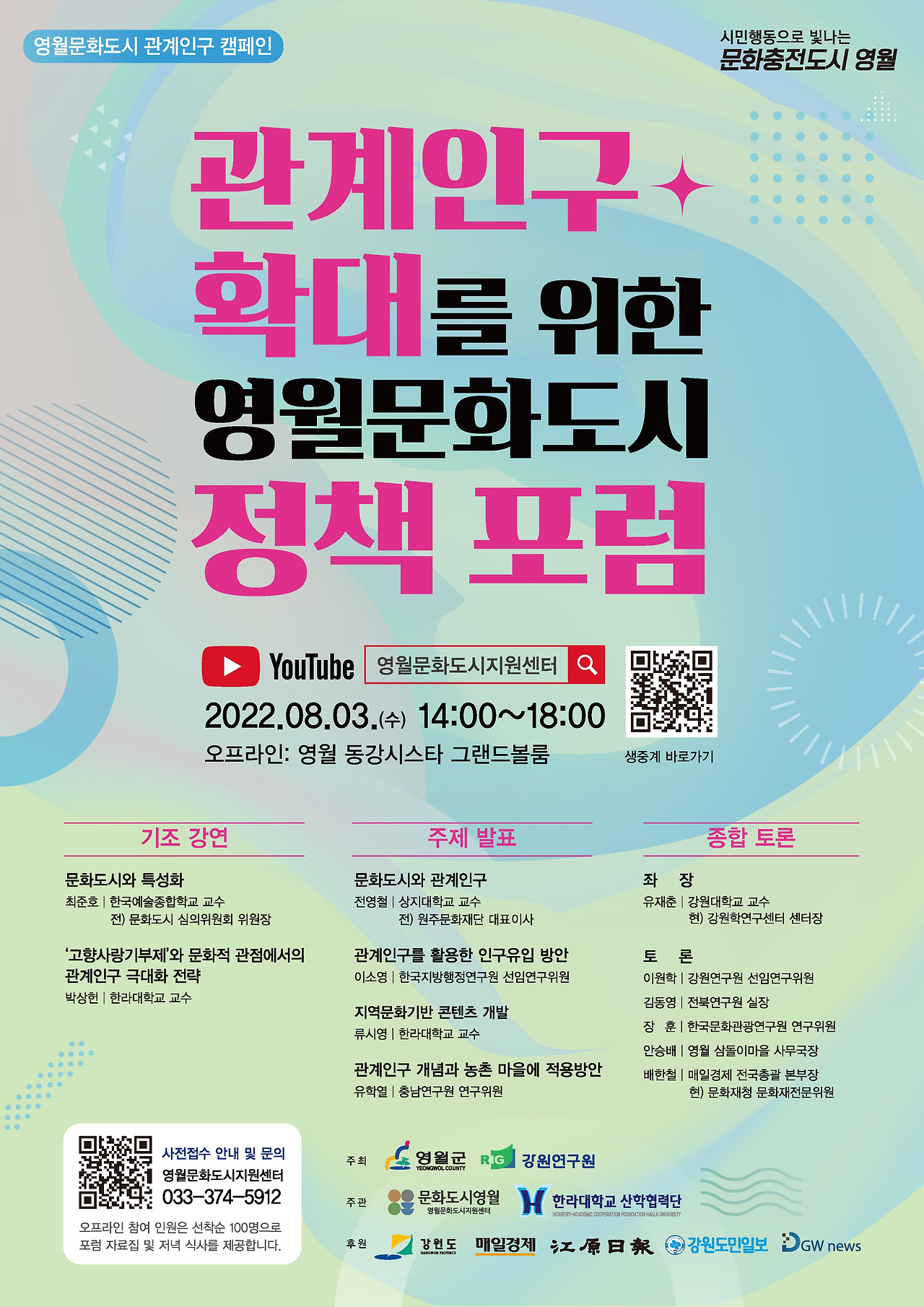 인구소멸이라는 지역의 문제를 문화로 풀어보려는 포럼이 영월에서 열린다. 관계인구 확대를 위한 영월문화도시 정책포럼. (2022/08/03)