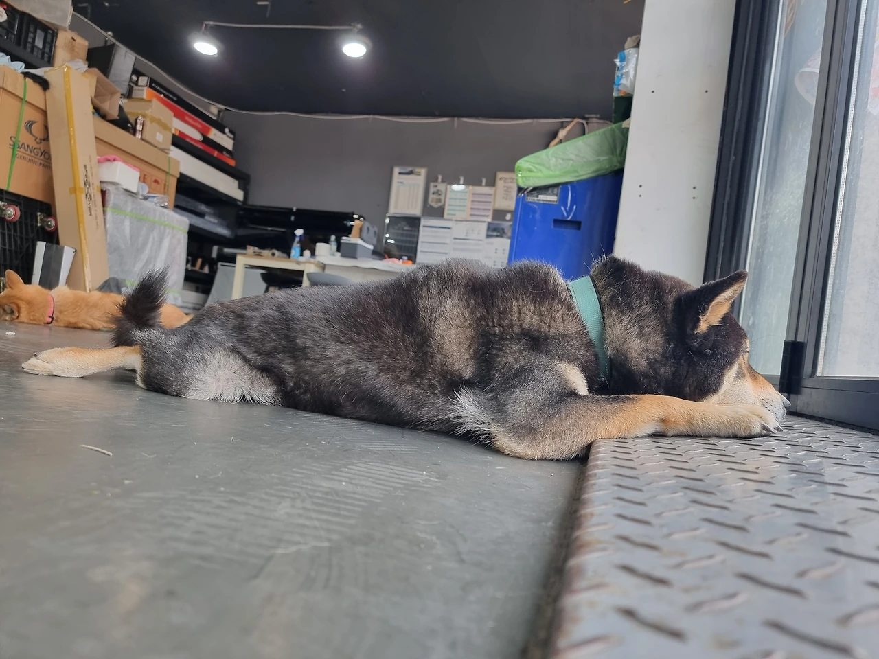 그날따라 작업해야 할 손님의 차는 끝이 없고, 나는 구구가 항상 출근하면 묶여있어야 하는 가게 폴딩도어를 남편이 작업할 때마다 차를 들이기 위해 열고 닫느라 정신이 없었다.