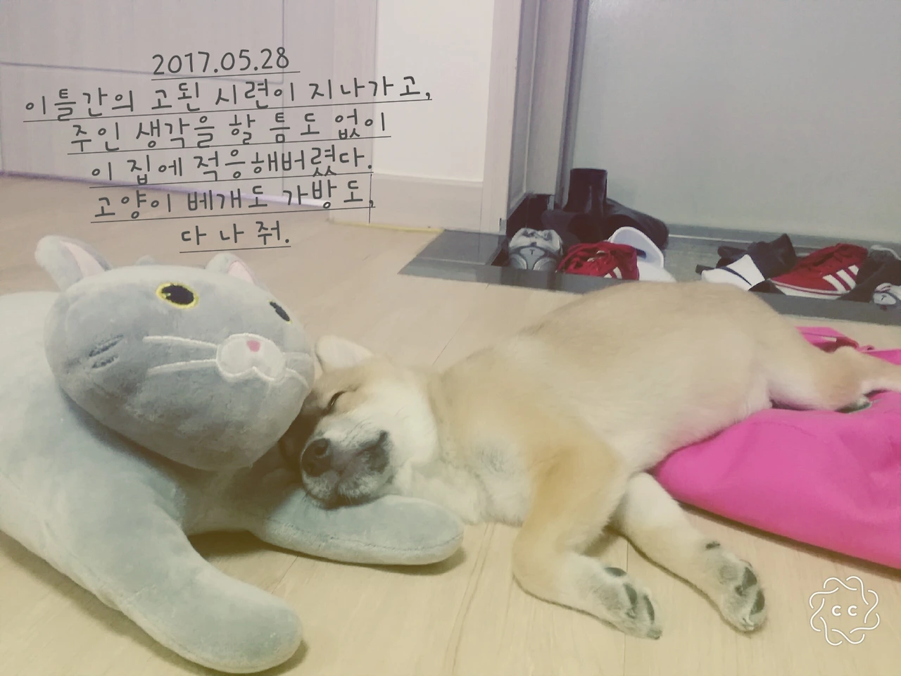 복구가 집에 온지 겨우 한달. 처음으로 인형을 베고 잠이 든 복구