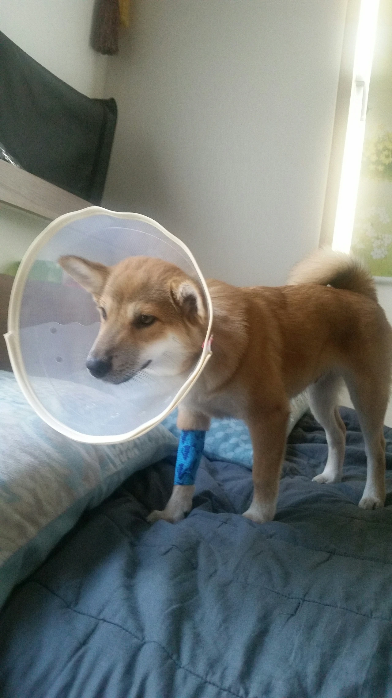 앞발에는 붕대, 얼굴에는 목카라를 한 환자 복구