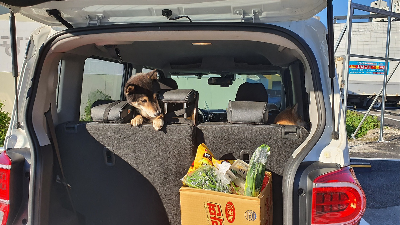이웃집 통키네 놀러갔다와서 에너지 만빵인 덕구 아이들이 두시간 가까이 쫓아다녀도 체력이 참 좋았다. 장볼 때도 함께 가면 늘 뒷자석에서 우리가 뭐사는지 감시하던 녀석.