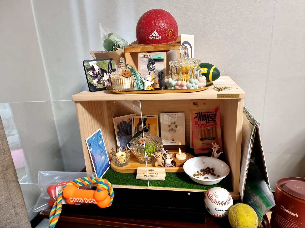 동생이 선물한 귀여운 위패에도 덕구 is Free 가 있다.그렇게 추모함을 가득 채울 동생의 선물들이 도착하고 우리는 울다가도 하나씩 하나씩 덕구와의 추억이 담긴 물건들을 쌓아올렸다. 제단에 기도하는 마음보다 사랑스럽게, 그러나 진심으로.