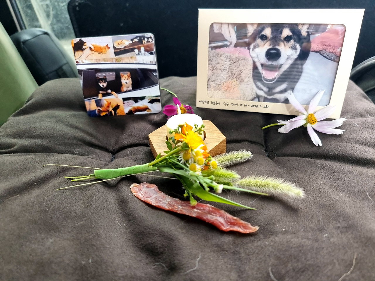 덕구의 자리를 빈자리로 남기고 싶지 않아, 작은 촛불과 산책하며 만난 꽃과 강아지풀을 챙겨 사진과 함께 놓아본다.