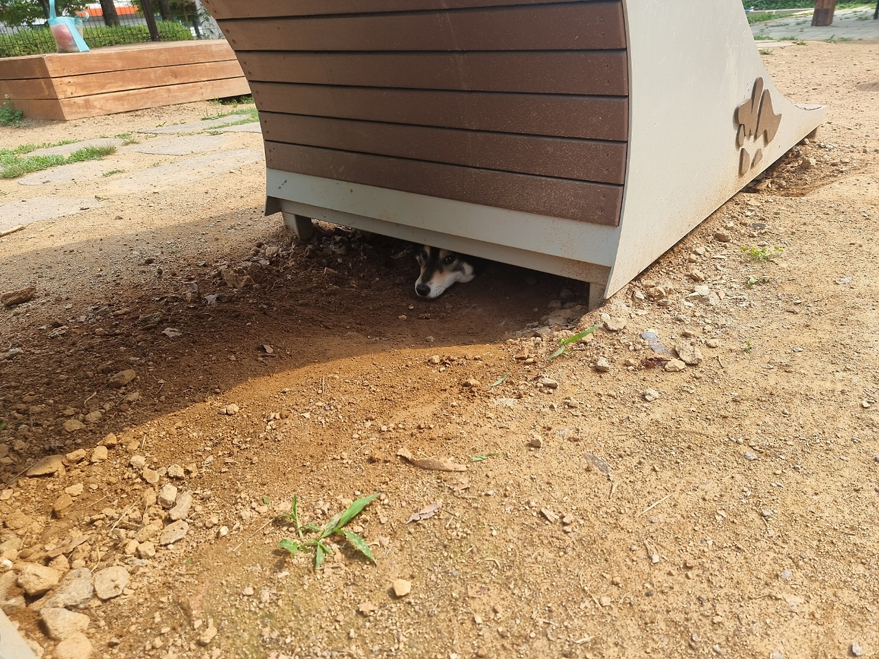 지붕에서 뛰어내릴 때 긁힌 턱 및 상처. 반려견놀이터에서 미끄럼틀 밑으로 땅을 파고 들어가 기어이 몸이 끼어버린 사고뭉치.