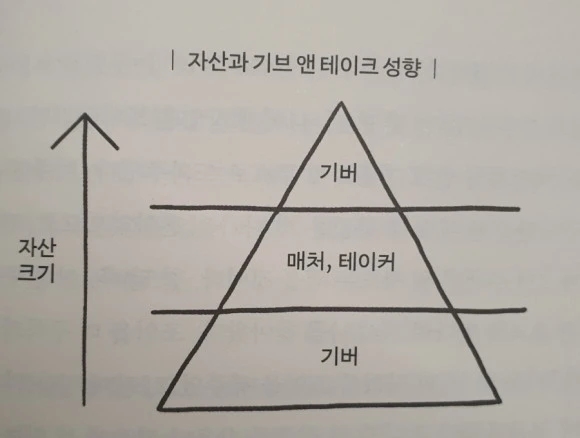 세 가지 분류의 사람으로 나눌 수 있다고 한다. 이 중 성공 가능성이 제일 낮은 건 기버. 그리고 성공 가능성이 제일 높은 것도 기버란다.