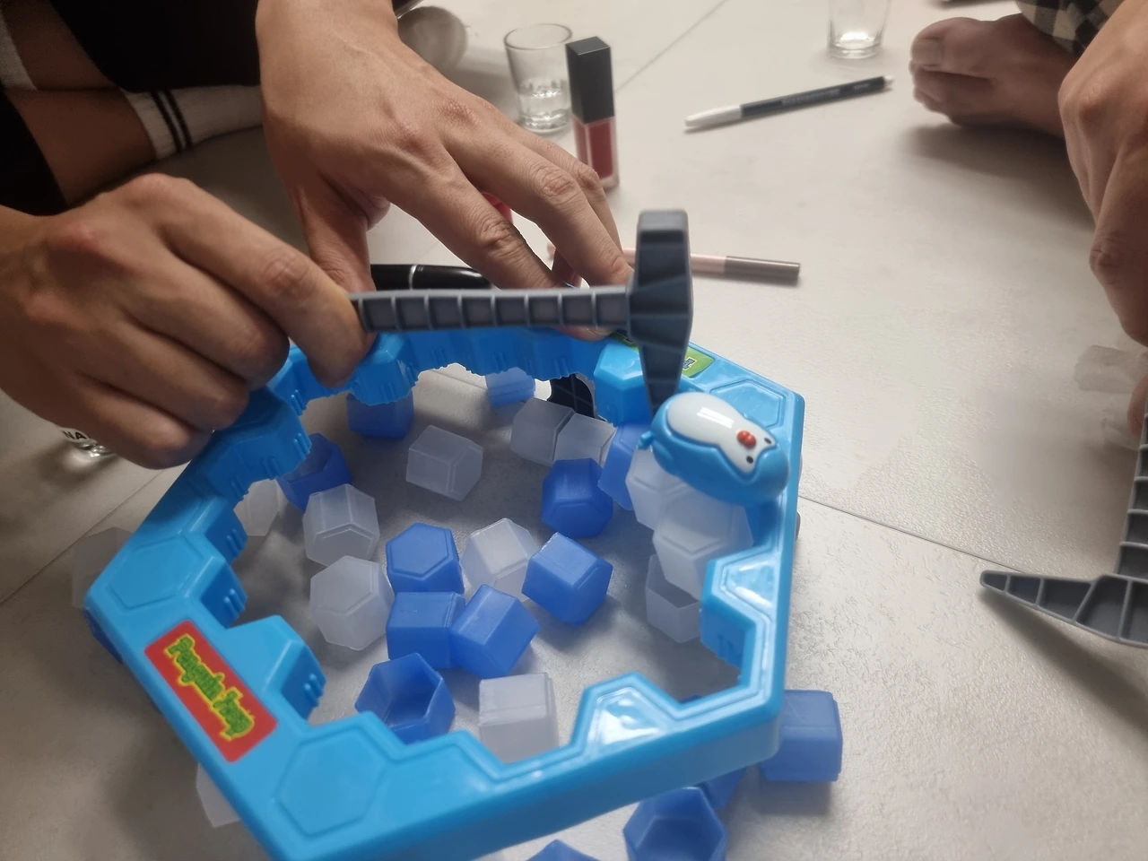 얼음벽돌같은 흰색블록과 파란색블록을 판에 끼워맞춘 후에 룰렛판을 돌려 판에 나온 개수만큼 같이 들어있는 망치로 얼음을 깨는 미션이다.