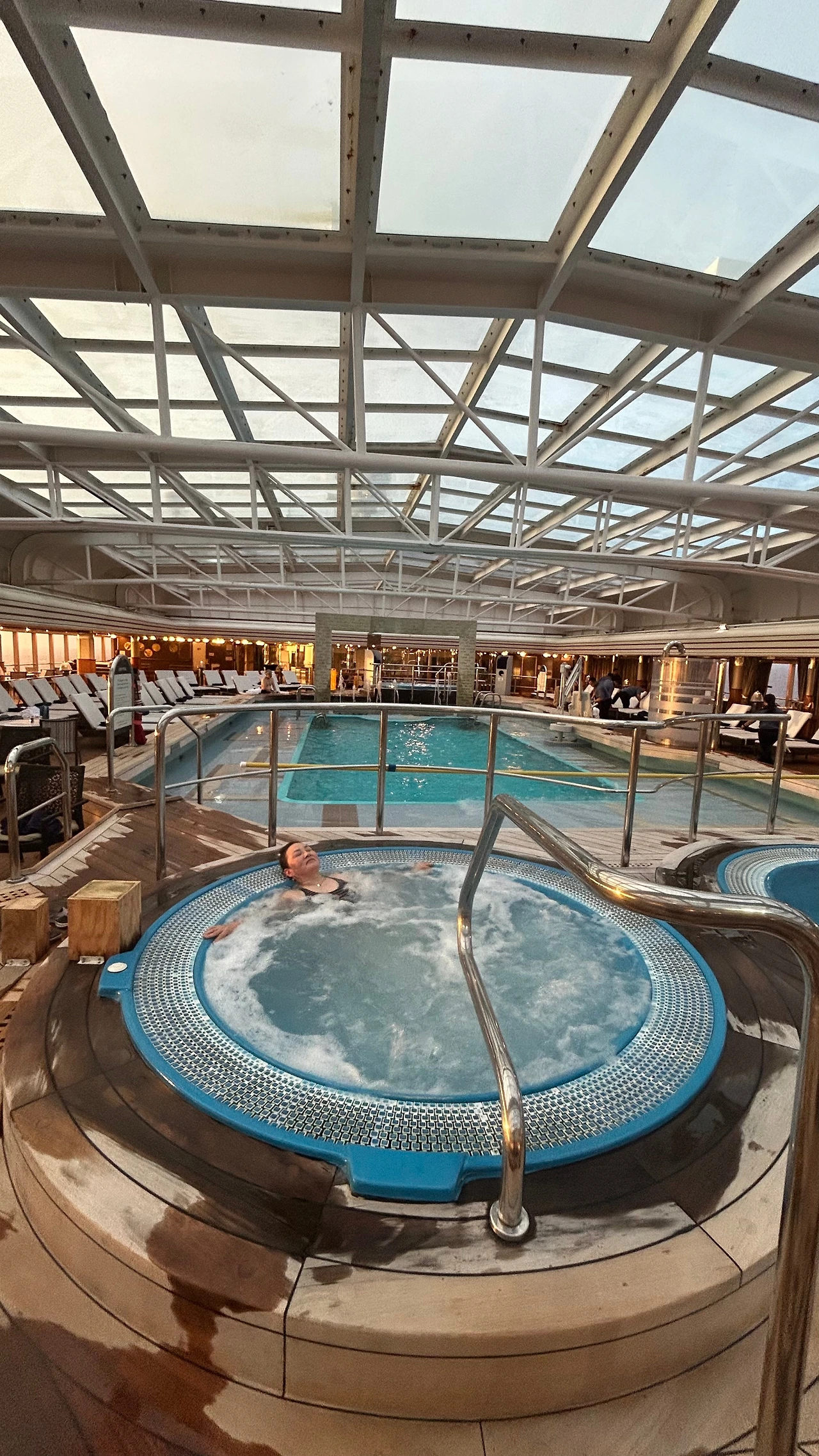 이 날 저녁엔 배로 돌아와서 수영장 옆의 핫스파에 몸을 담그고 샴페인을 마시며 피로를 풀었다.