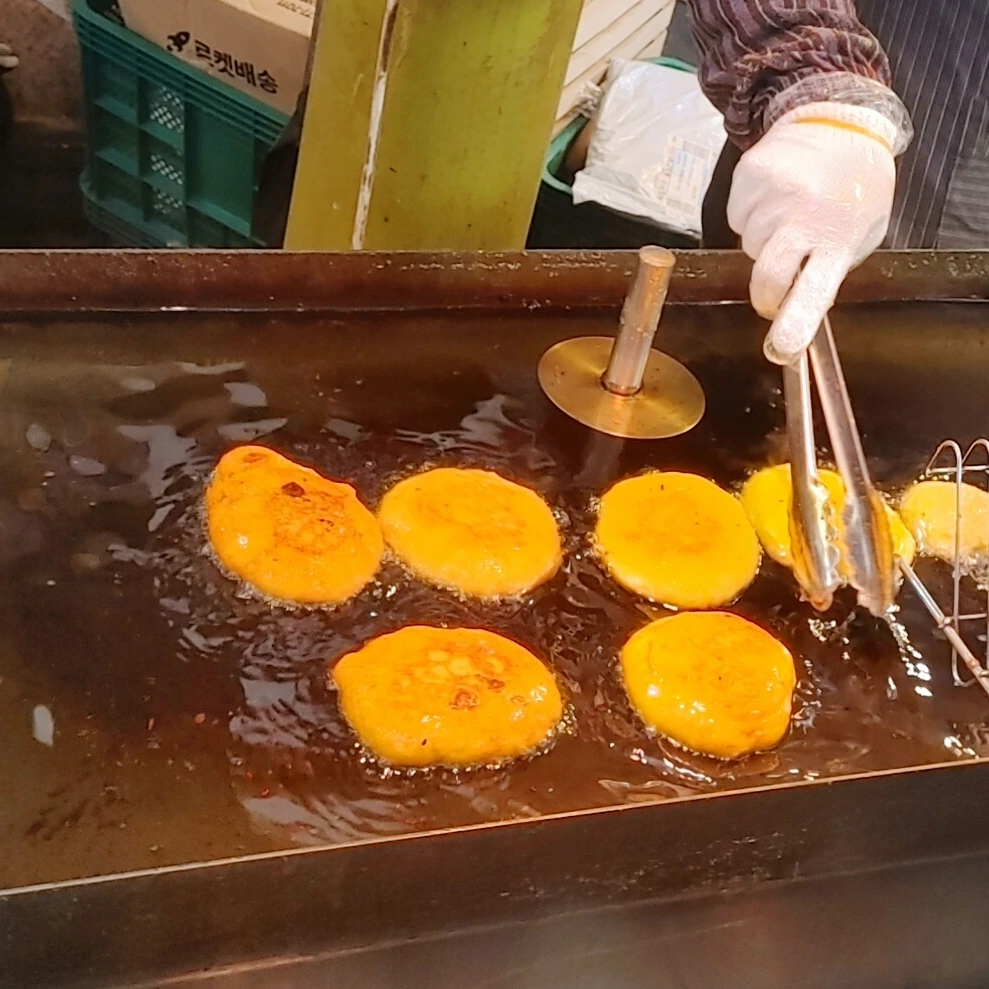 11월의 마지막 주말, 유난히 오싹한 날이었기에 먼저 따뜻한 것부터 찾았는데 바로 옆 지글지글 끓는 기름 속에 구워지고 있는 호떡이 눈에 띄었다. '굽다'가 아니고 거의 튀겨지고 있는 느낌이었다.