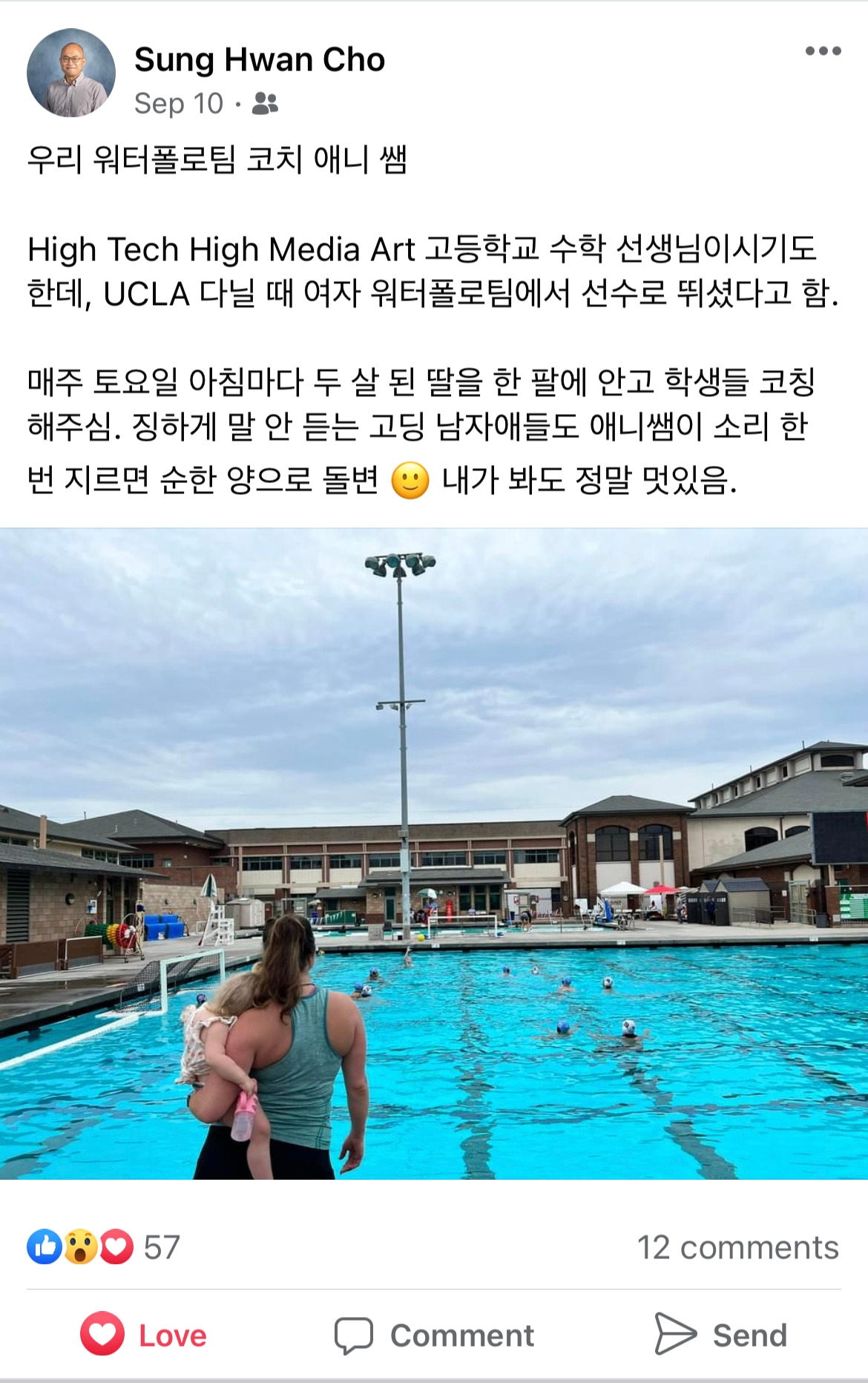 나중에 알고 보니, 여자 워터폴로 팀도 코칭 스텝이 부족했고, 폴의 아들이며 남자팀 주장인 데이빗도 남자팀의 비시즌인 여자팀 시즌에 여자 워터폴로 코치로 자원봉사하고 있었다. 참고로 아빠의 이런 헌신적인 노력과 본인의 출중한 커리어 관리로 데이빗은 올해 동부의 좋은 사립학교에 진학했다.