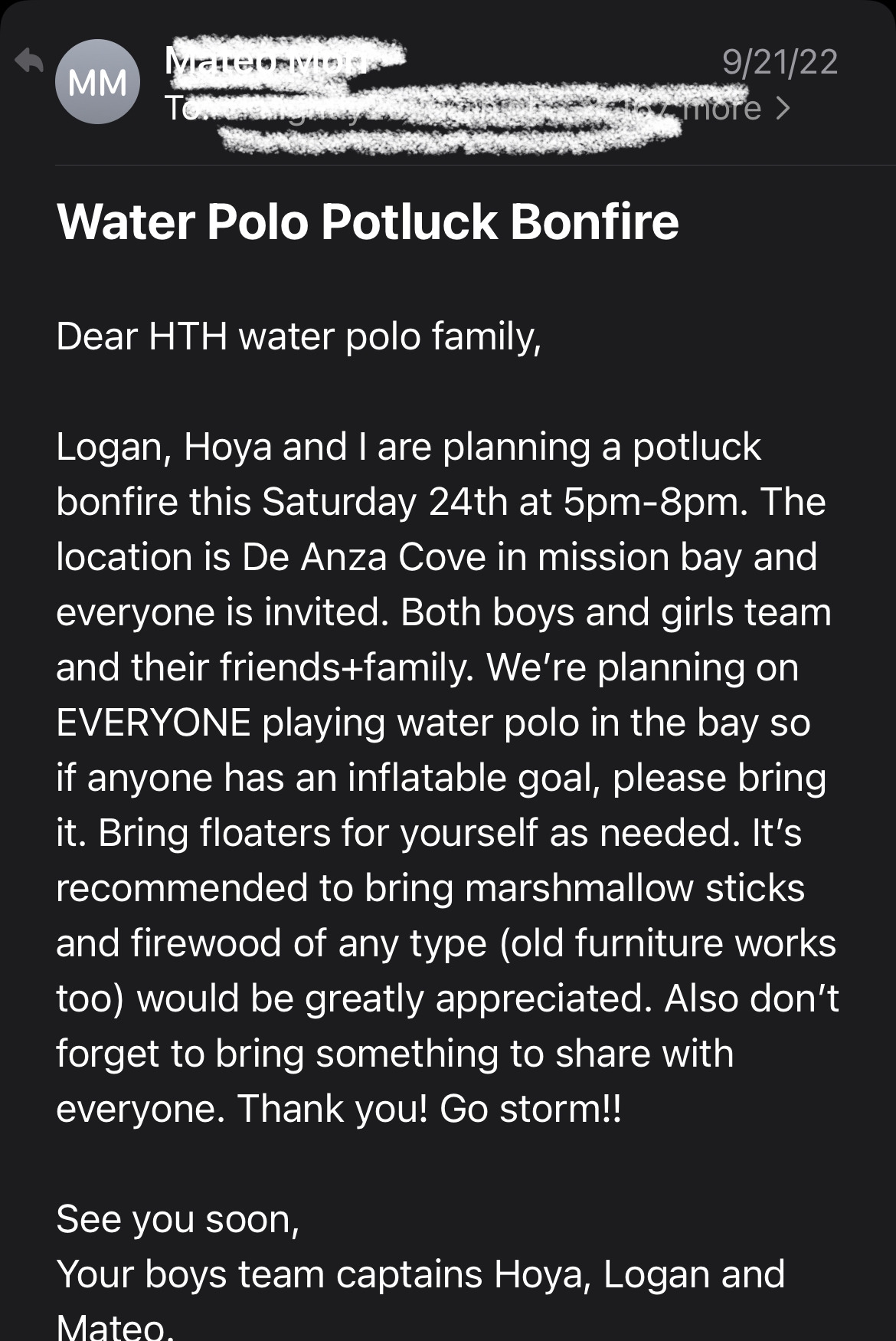 우리 학교도 예외는 아니어서 우리 아들이 뛰고 있는 수영팀, 그리고 워터폴로팀도 역시 학부모의 기부금으로 운영되는데, HTH의 학교들은 한 학년이 기껏해야 100명 정도밖에 안 되는 작은 학교를 지향하는 만큼, 한 학교 단독으로 팀을 꾸릴 수가 없다. 그래서 포인트 로마 캠퍼스에 있는 세 개의 고등학교, 즉 High Tech High, High Tech High International, High Tech High Media Arts 이 함께 연합팀으로 High Tech High 운동부가 구성되어 있다. 문제는 수영팀은 오랜 기간 동안 코치/포토그래퍼/운영팀으로 합을 맞춰와서 굉장히 안정적으로 돌아가는 데 반해, 남자 워터폴로팀은 그렇지 못하다. 항상 아슬아슬하게 운영되어 왔다.