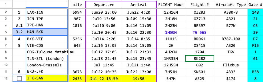 RTW에서 가장 어려운 구간이 태평양 구간, 유라시아 구간, 대서양 구간인데 태평양 구간과 대서양 구간은 수월하게 내가 원하는 티켓이 나왔다. 유라시아 구간이 문제였다. 한 번도 동남아를 가 본 적이 없어서 동남아를 꼭 들르고 싶었는데, 동북아에서 동남아를 연결하는 구간, 동남아에서 유럽 연결 구간 찾기가 너무 어려웠다. 보통 이 구간은 출발 350일 전에 티켓이 나오자마자 다 팔리는 구간인데 나는 300일 정도쯤에 예약에 들어갔으니 늦어도 한참 늦은 것이다.