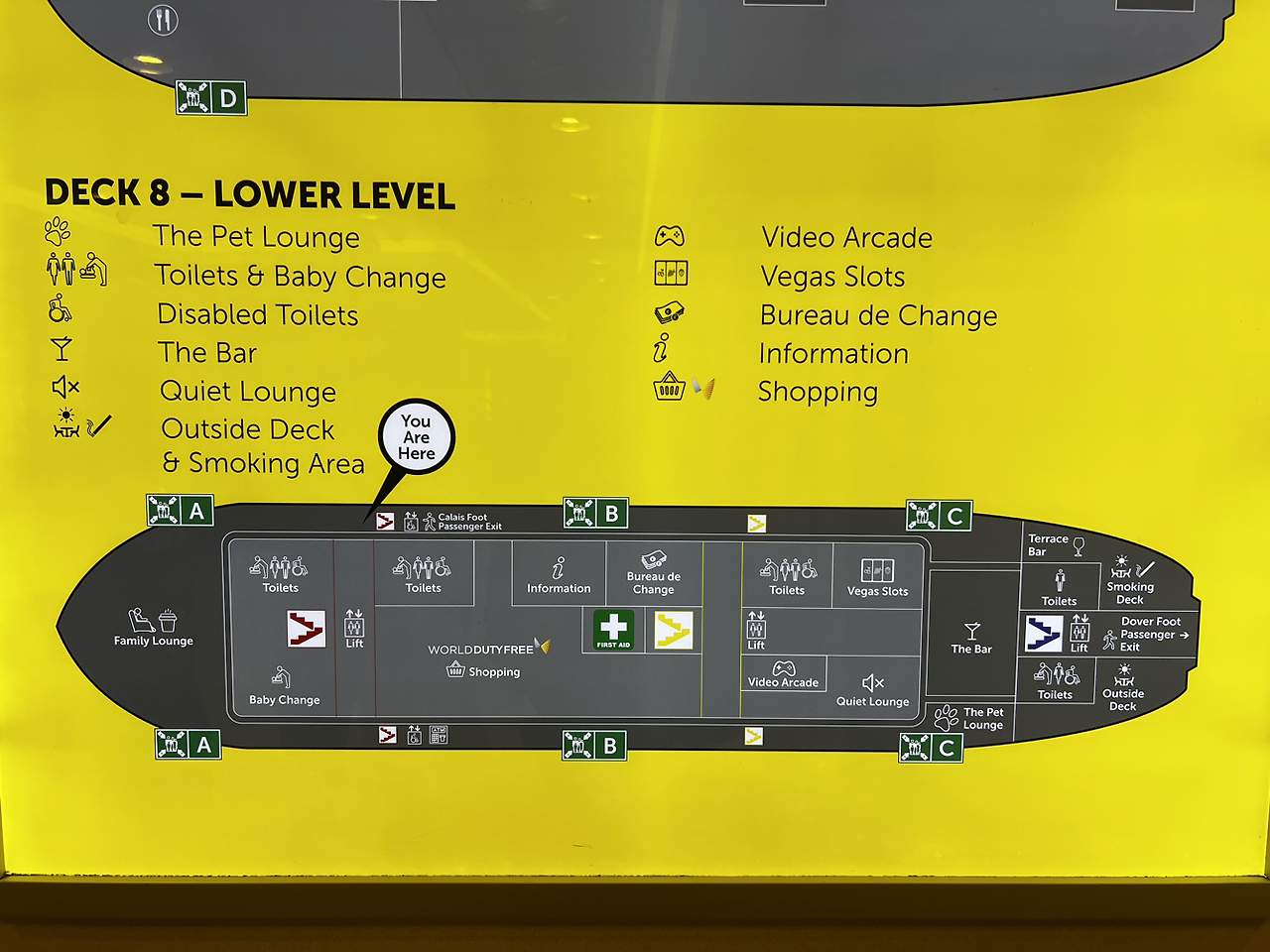 도버 해협을 건너 칼레까지 약 1시간 반 정도 소요되는 이 페리는 아주 호화로운 편은 아니었지만, 편의 시설들은 다 갖추고 있었다. 사람들은 식당가에서 식사를 하거나, 면세점에서 쇼핑도 했다. 누워서 쉬는 사람들도 제법 많았다.