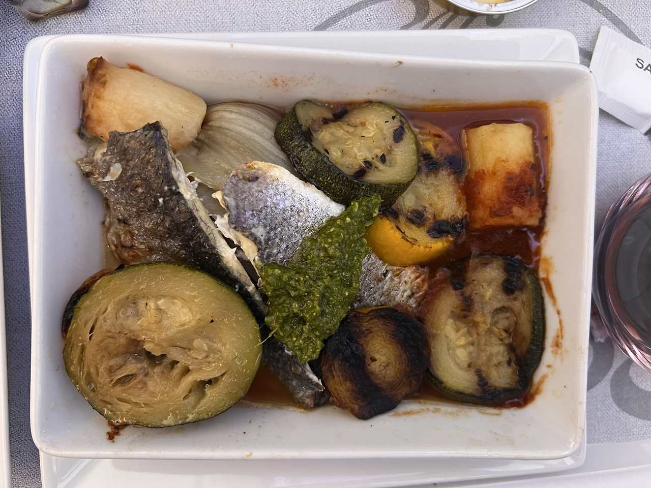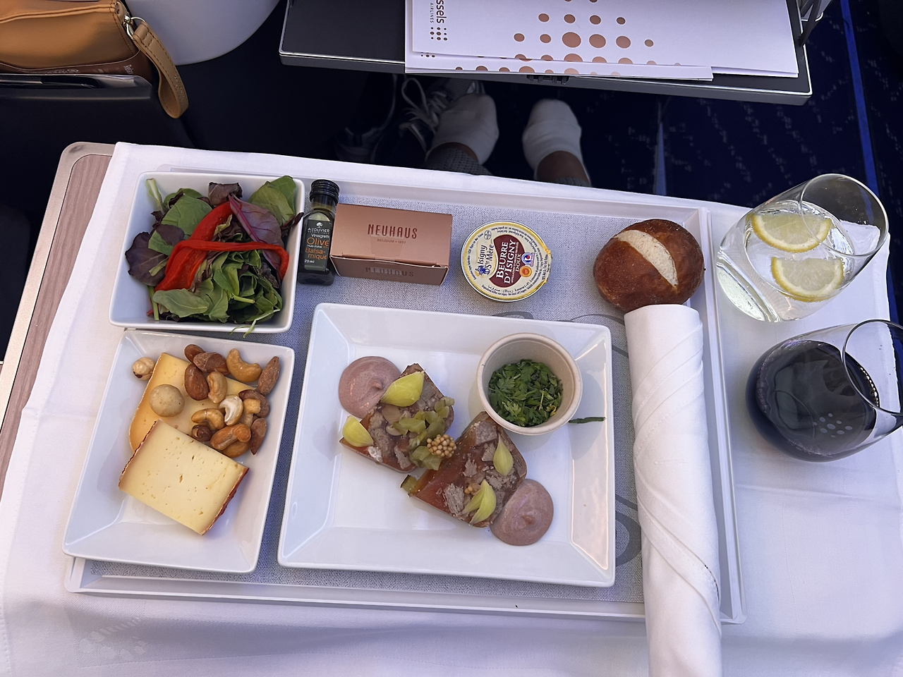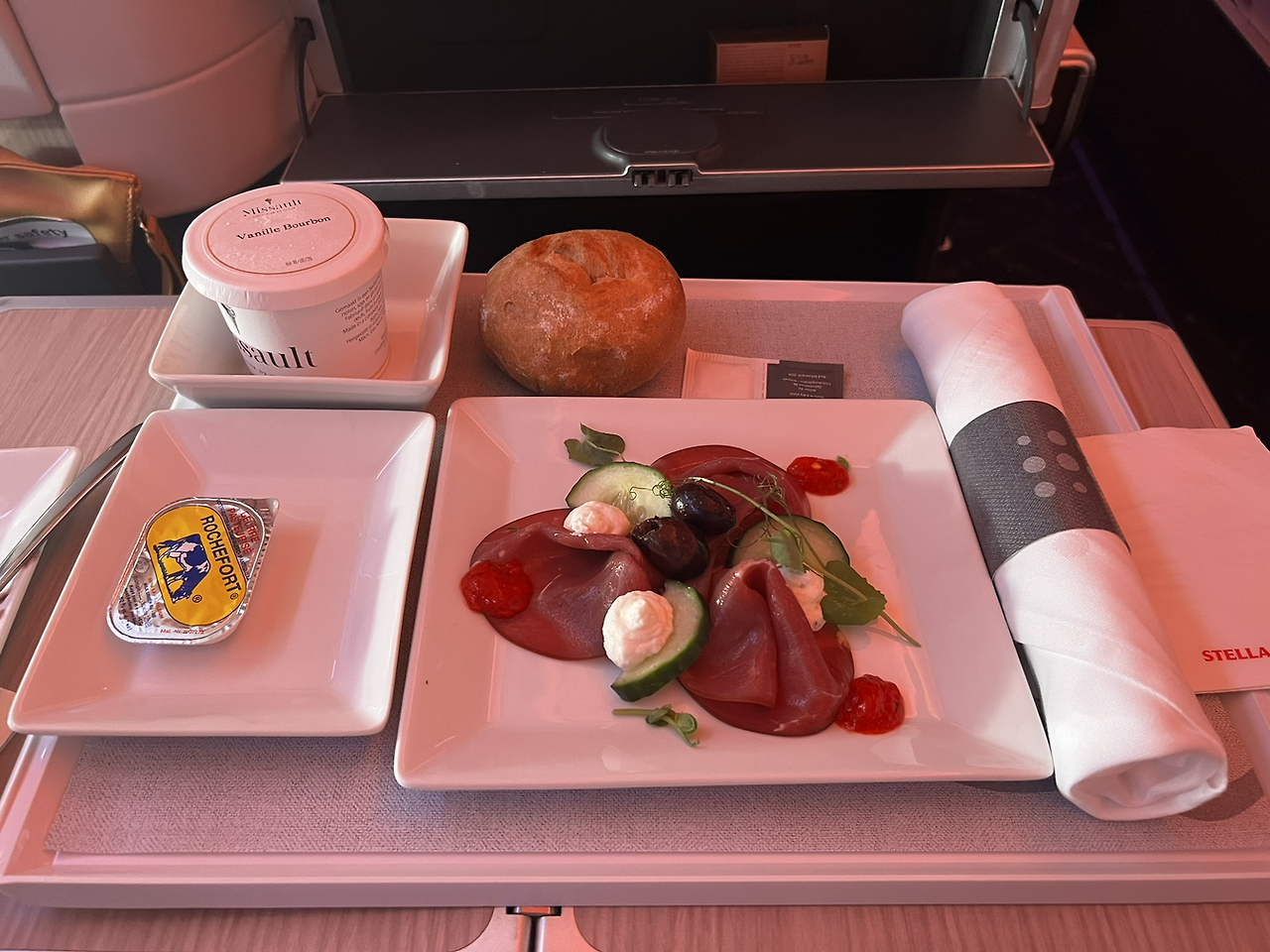 역시 웰컴 드링크로 서비스를 시작한다. Nicolas Feuillatte Reserve Brut, N.V 샴페인(왼쪽)이 제공되고 있었다. 앙트레와 치즈, 그리고 샐러드까지 일단 함께 서빙되고, 빵은 승무원이 따로 바구니에 담아서 하나씩 원하는 빵을 고르도록 한다(가운데). 가운데 음식 사진 속에 치즈와 포크 중간에 있는 애피타이저가 메인 요리 접시(오른쪽) 자리에 놓인다. 나는 생선 요리를 시켰고, 레드 와인이지만 생선 요리와도 잘 어울린다는 승무원의 추천에 따라 2020년 산 상테밀리옹 그랑 크뤼인 플뤼르를 주문했다. 사실 이번 여행에서 가능한 좋은 와인들을 많이 마셔보면 와인의 세계에 조금이라도 입문할 수 있을까 싶은 생각이 있어서 무조건 유명하다 싶은 와인을 마시긴 했는데, 역시 아직도 그 맛을 잘 모르겠다. 와인은 나에게는 아직도 가까이하기엔 너무 먼 당신이다.