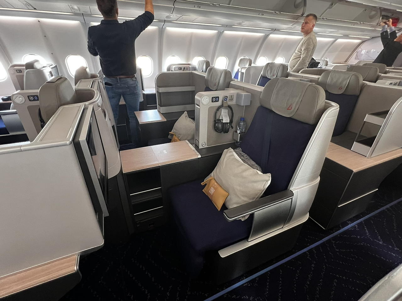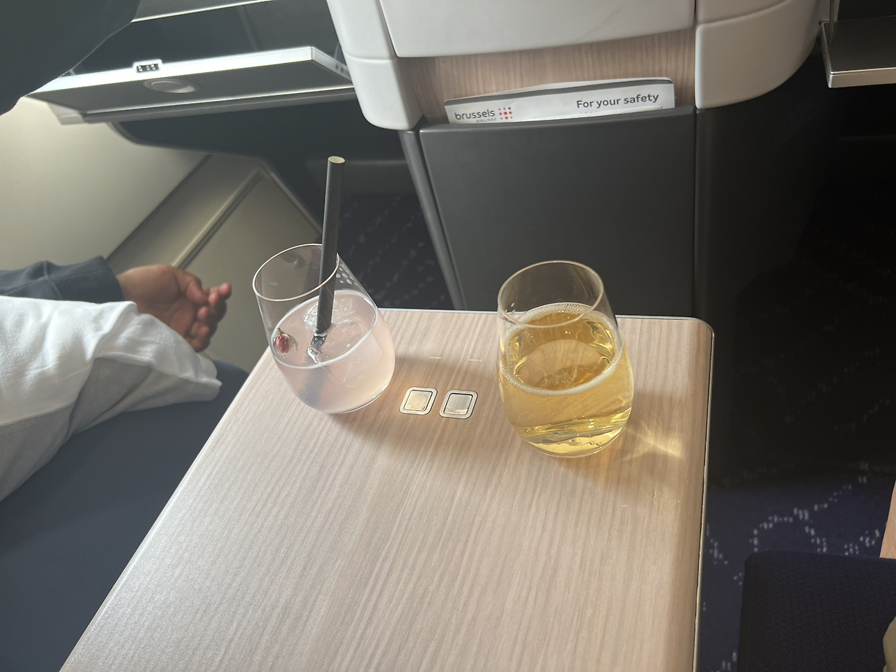 A333으로 운항되는 SN501편 비즈니스 석은 1-2-2- 혹은 2-2-1 배열로 좌석이 앞뒤로 지그재그로 배치되어 있어서 혼자 여행하는 승객도 독립적으로 앉을 수 있다는 장점이 있었다. 사실 내 앞에 앉은 1인석이 나와 호야가 앉은 2인석보다 1인당 공간 점유 면적은 더 넓었다.
