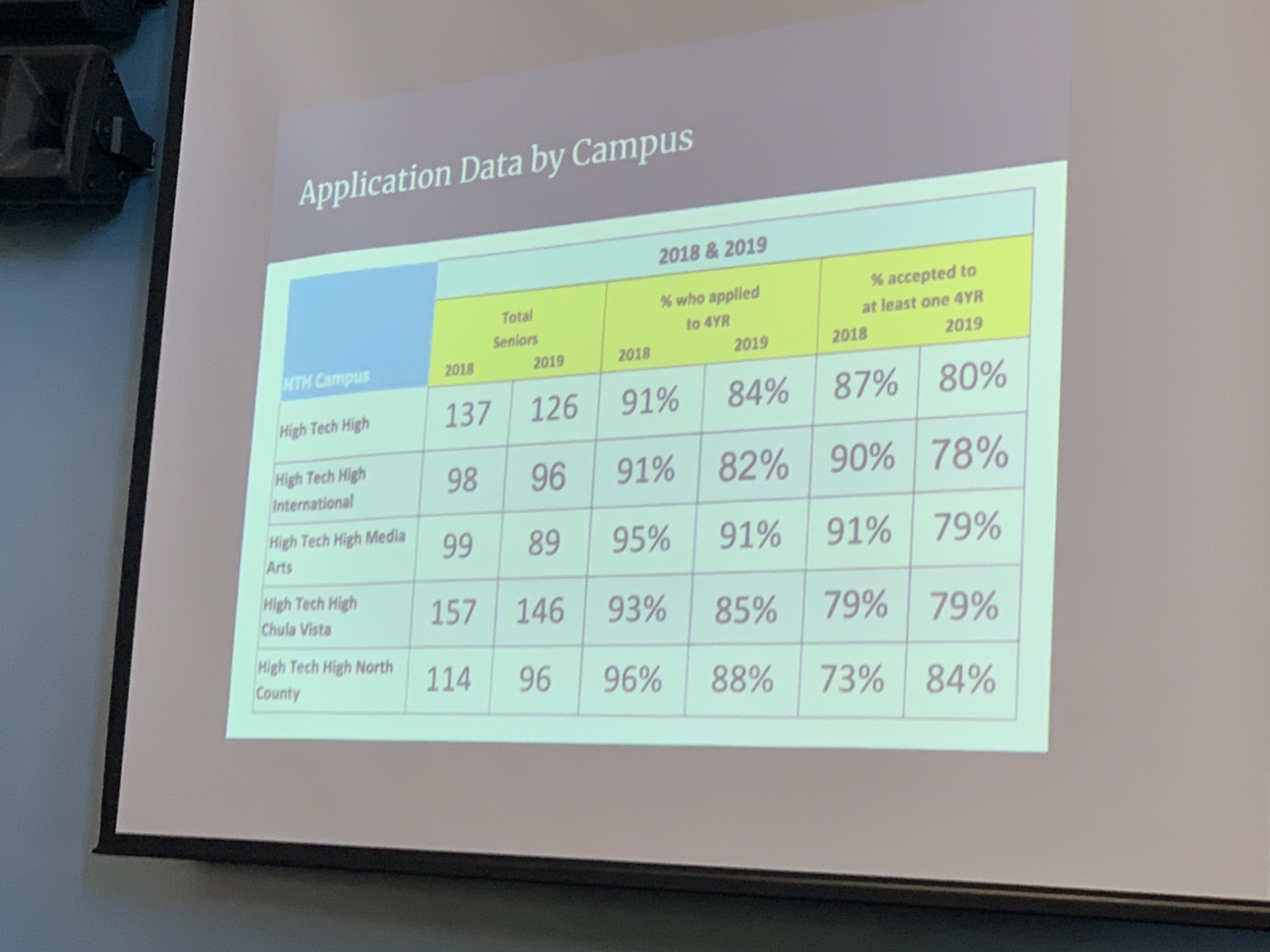 왼쪽 표에서 보다시피 4년제 진학률이 작년에 비해 낮아졌습니다. 95%가 대학에 진학하는 HTH는 65%가 4년제 대학에 진학하는 것에 비해 CA 전체는 35%, 샌디에고 카운티는 38%밖에 되지 않습니다(오른쪽). 상당수의 학생들이 지역 커뮤니티 칼리지에서 전공 기본 과목을 이수한 후 4년제로 편입하는 것을 더 선호한다고 학교에서는 보고 있습니다. 이런 방법이 바로 4년제로 바로 입학하는 것 보다 더 저렴하게 학위를 받을 수 있기 때문입니다. CA주의 4년제 대학은 입학률이 35%