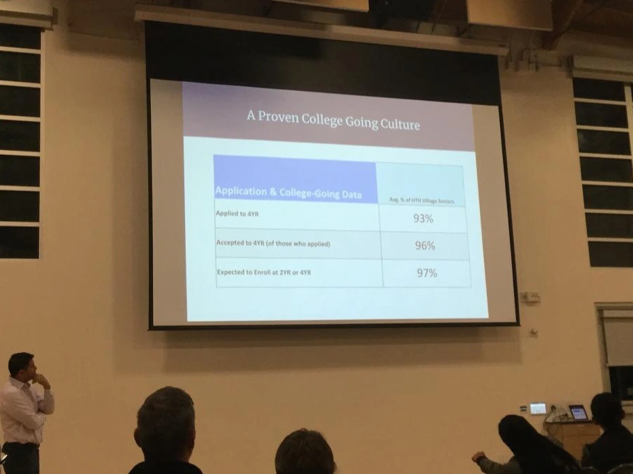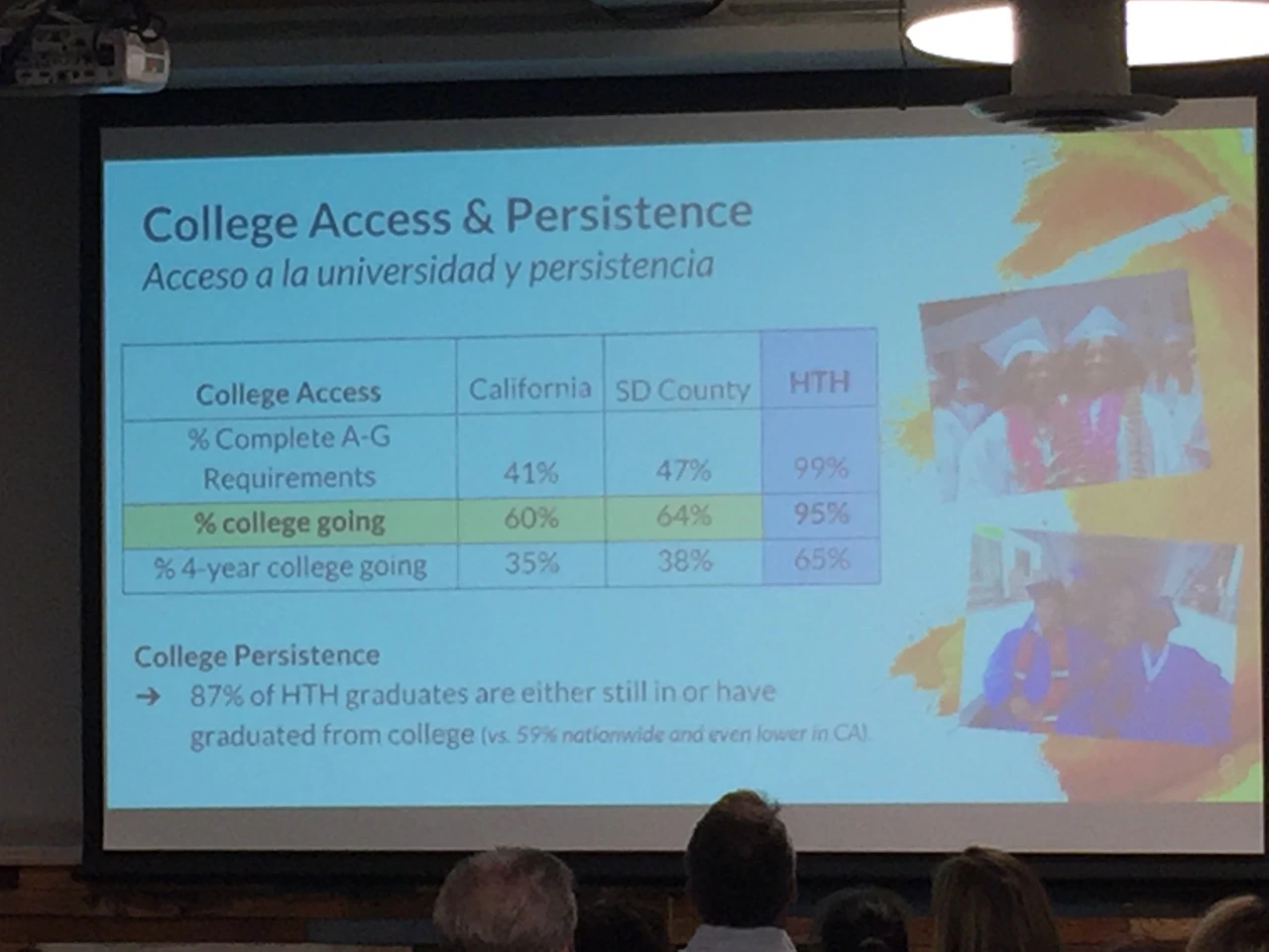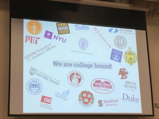 HTH에서는 학생들을 선발할 때 모든 지역에 동일한 비율로 학생들을 추첨으로 선발합니다. 그 결과 55%의 학생들이 유색인종(거의 대부분 히스패닉)이고, 45%의 학생들이 정부에서 점심을 제공받는 저소득층이라고 해요. (참고로 학교에서 점심을 제공받는다는 것은 최저 소득 이하의 소득 수준을 가진 가정이라는 것을 의미합니다.) 이런 배경을 가진 학생들이 대학에 진학할 때 경제적인 부분을 고려하지 않을 수가 없겠지요.