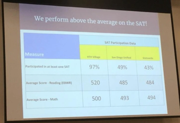 저희 학교가 속해있는 샌디에고 학군에서 SAT를 최소한 1번 보는 학생들은 49%, 전국적으로는 43%입니다. 이에 반해 HTH의 고등학생들은 97%의 학생들이 SAT를 보고요, 이 학생들의 평균은 학군평균과 전국 평균보다 높다는 것을 위의 표에서 보실 수 있습니다.
