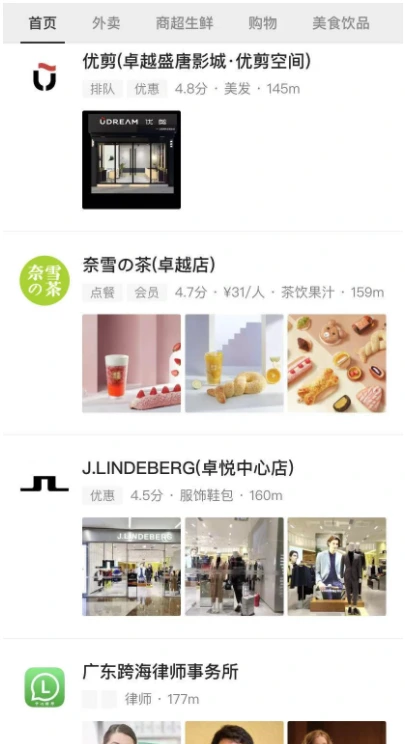 그리고 내 위치에 따라서 근처 오프라인 매장 등에서 운영하는 미니 프로그램이 자동으로 추천되기도 한다. 해당 미니 프로그램을 누르면 매장에 대한 주문, 예약, 판매 등이 모두 가능하다. 또한 업종 별로도 찾아볼 수 있다.
