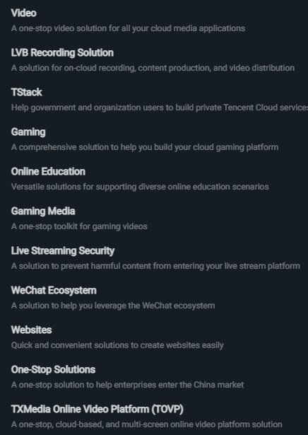 2020년 기준 텐센트 클라우드에는 8천 개가 넘는 고객사를 보유하고 있으며 전 산업 업계 대상으로 클라우드 서버만 지원하는 것이 아니라 컴퓨팅, 저장공간, 서버, 데이터베이스, 도메인, 네트워크, 빅데이터, 인공지능, 동영상, 게임 등 300여 가지 이상의 솔루션을 제공 중에 있다. IT 관련 분야별, 그리고 업종별로 정리가 되어있어서 희망하는 내용의 서비스를 받아보게끔 서비스가 구성되어있다.