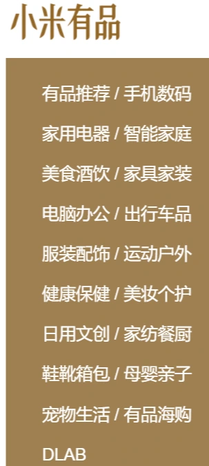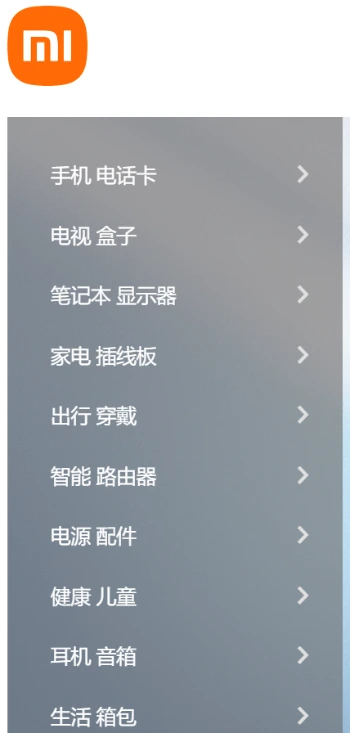 - 범(范) 샤오미 생태계와 제삼자 브랜드까지 포함한 온라인 쇼핑몰인 샤오미 여우핀(小米有品)이 있다.