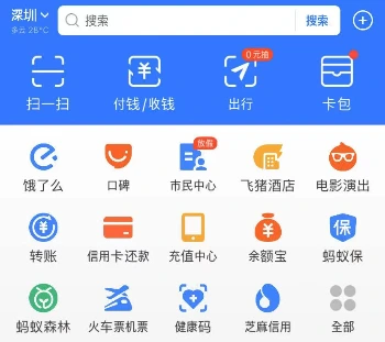 알리페이 어플에는 비행기, 철도, 영화, 호텔 등의 예약 서비스, 핸드폰 요금 충전, 외식 및 음식 배달 등으로 이어지는 다양한 생활 기능을 사용할 수 있는데 그 기업들은 알리바바가 지분을 가지고 있는 등의 매우 밀접한 서비스들이다.