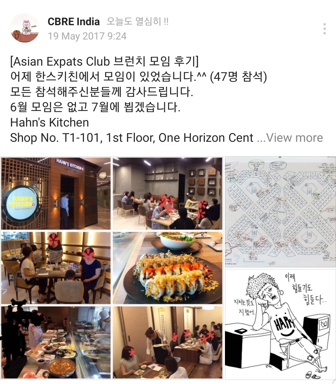 인도에서 부동산 일을 시작하면서 많은 사람들을 만났다. 그중엔 가족들과 함께 온 주재원 분들도 계셨지만 혼자 오신 분들도 많았다. 특히 외국계 기업에서 코리안 데스크 담당으로 유일한 한국인으로 일하고 계신 분들도 계셨다. '다들 주말에는 뭐하며 지내시지? 타지에서 외롭지는 않으실까? 내가 어떤 도움을 드릴 수 있을까?' 이런저런 고민을 하다가 직장인들을 위한 모임' , '아시아인들을 위한 파티'를 주최하여 직장인들끼리 교류할 수 있는 모임을 기획해 보았다. (물론 코로나 이전의 일들이다.)