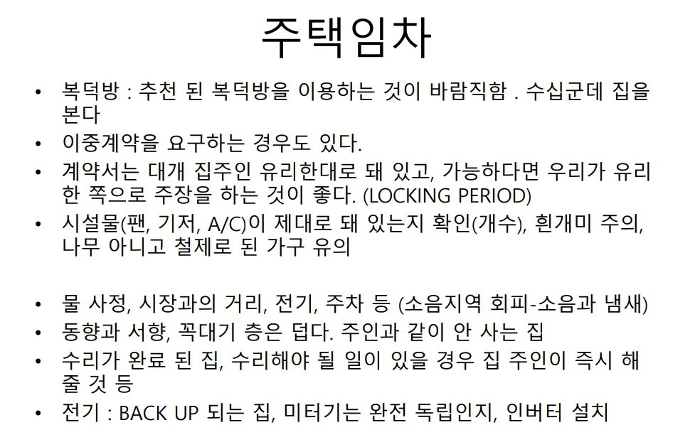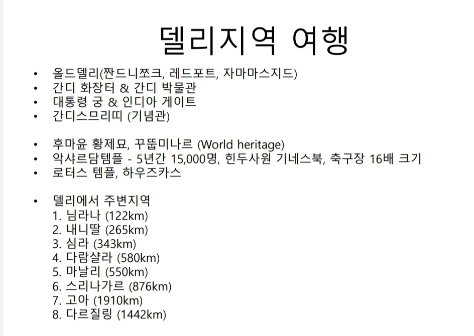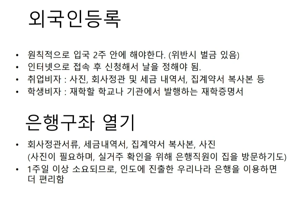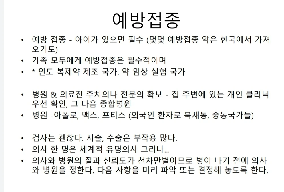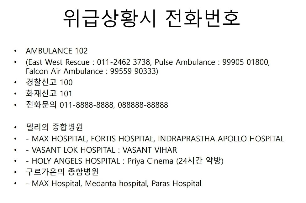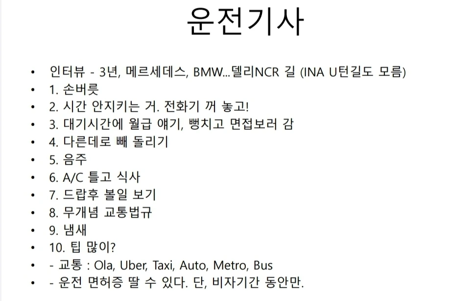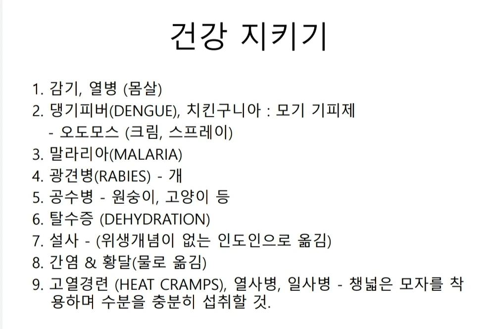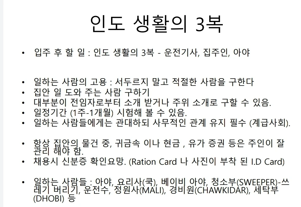 뎅기열 환자 급증 1) 말라리나 2) 치쿤구니아 3) 뎅기열 : 죽기 직전까지 아프고 죽지는 않음// 뎅기열 앓느니 군대 감 한국 모기약은 인도에서 잘 안 든다. 인도 모기약 전자 훈증기 강함 - 사람까지 잡으니 활동 안 하는 시간, 장소에 피우고 끄기 / 인도 모기를 잡으려면 인도 모기약을 쓰는 것이 좋다. 개, 원숭이 사람을 두려워하지 않으니 주의 // 지들 기분 안 좋을 땐 사람을 공격함 여행지에서 원숭이 배경으로 셀카 찍다 물릴뻔한 사람도 있음 // 물리면 병원 가야 함 -> 많이 아픔 소 조심 : 소가 길을 막으면 돌아서 가라. 힌두 극우가 있을 경우 소를 때리다 걸리면 매우 곤란해짐 상비약 : 인도에서 구할 수 있는 좋은 약들도 많지만, 초기 정착에 필요한 약은 가져올 것 // 의사소통 문제로 잘못된 약을 처방받을 수 있음 인도 영어는 적응 기간이 필요함 소화제 챙겨 오면 좋음 (체했을 때 먹을 수 있는 인도 약 없음) // 체한 느낌을 영어로 어떻게 설명할지 난감함.. 병이랑 상관없는 약을 처방해 줄 수도 있는 위험 부담 KF 94 정도의 마스크 인도에 없음 일상, 취미 권유 // 인도에 등산 불가 낚시 불가 (강에 가보면 안다.) 한국인 취미 : 음주, 골프, 여행, 드물게 요가, 축구, 농구 취미를 만들어서 찾아서 준비해서 인도 오세요. 여가시간에 딱히 할 것이 없음 주의. 한국처럼 늦게까지 먹고 마실 수 있는 술집 없음 // 인도는 알콜샵 가서 술 사서 집에서 마시면 됨 FRRO - Foreign Residents Register Office 외국인 거주 등록 14일 내로 하기 / 집 계약서 사본 필요함 14일 내로 못 끝내면 벌금 있음 / 직원의 기분대로 벌금 차이 있음 10개월 신고 늦어도 벌금 안무는 경우 있고 한 달 늦어도 벌금 50만 원 낸 경우 있음 모든 서류는 사진을 찍어서 history를 만들어야 함. 서류를 갖고 있지 않으면 싸움에서 진다. 증명해야 할 일에 생김. 초기 정착 때, 여권 비자 복사본 넉넉히 챙겨 오기. 복사집 찾기 힘듦, 사진도 넉넉히 찍어오기 집 계약 시, 부동산 계약서 사본 넉넉히 해두기. 인터넷, 핸드폰 개설 시 요구함 사무실 안에 직급이 높지만 계급이 낮으면 말을 안 듣고 소통에 문제가 생김.. 불편해함 이때 중재 안 해주면 업무가 꼬임.. 카스트를 직접적으로 물으면 실례임.. (이름 보면 계급 대충 알 수 있음) 한국인과 인도인은 매우 성향이 다름 많은 감정을 경험할 것임 (자괴감 들 수 있음 / 내가 이런 사람인가?) <- 이 부분 개인적으로 너무 공감 (내가 이상한 게 아니었음) 인도인 자존심을 상하게 하면 동기부여가 되지 않고 상해로 돌아올 수 있음 델리 이외 지역은 법보다 주먹이 우선 나감 한국인 : 이 정도도 돈을 받으면 이만큼 일 해야지 인도인 : 회사에서 나를 뽑았으니 당연히 월급 줘야지 단순 월급으로 동기부여 안됨 / 주인의식 없음 일을 맡기고 결과를 보지 마세요. 일을 맡기고 중간중간 과정을 확인하며 같이 결과를 봐야지 안 그러면 처음부터 다시 해야 하는 경우가 허다함. 알아서 하는 인도인 거의 없습니다. 한국인 특징 : 화가 많음 / 소리 지르고 화내는 것 인도인은 화를 내는 상대방을 받아들이는 쿠션이 없음 힌두신 람의 인품이 인도인이 바라는 인간상. 람은 화를 내지 않음. 너모 좋아하는 신 인도인들은 화내는 한국인과 일하기 힘들어함. 화를 유발하는 것은 인도인이지만 상대방의 화를 소화 못 시키고 변화 안됨. 인도인에게는 사회적 체통, 체면이 없음. 좋게 말하면 자기 밥그릇 얄밉게 잘 챙기고 자기주장이 확실함. 자기 실수 책임 전가하거나 모르는 척. 뻔한 거짓말을 강하게 주장함. 한국인에게는 화만 남. 이때 팁, 인도인과는 문자로 주고받고 증거를 남겨야 함. 인도인은 아예 없는 능력을 자기가 잘한다고 함. 인도인 고용 시 문서, 면접에서 말만 듣고 믿으면 안 되고 반드시 실기 면접을 해야 함. 인도는 한국처럼 여성에 대한 억압의 짧지 않음.. 몇천 년 전부터 이어져 왔음. 인도에서는 여성을 사회적 약자로 낙인찍혀서 보상 문화가 있음. 법을 악용. "덤벼, 인도에서 여자와 싸우는 게 뭔지 알려줄게. " 인도 여자랑 시비 붙었다가는 위험해질 수 있음. 자동차 구매 시 1. 음주운전 심한 나라라 방어운전 조심 2. 많은 인도인들 자동차 보험 가입 안 함 자동차 사고 -> 트럭이 긁음 -> 경찰 불러봤자 감옥에 보내는 게 전부 -> 대부분 자동차 사고가 나면 보상 못 받음 -> 자동차 보험 목적은 내 차 수리, 내가 고칠 목적임 15년 이상된 중고차는 매매 금지 15,000원에 코로나 백신 가능 (돈 주고 맞는 백신은 재고 있음)