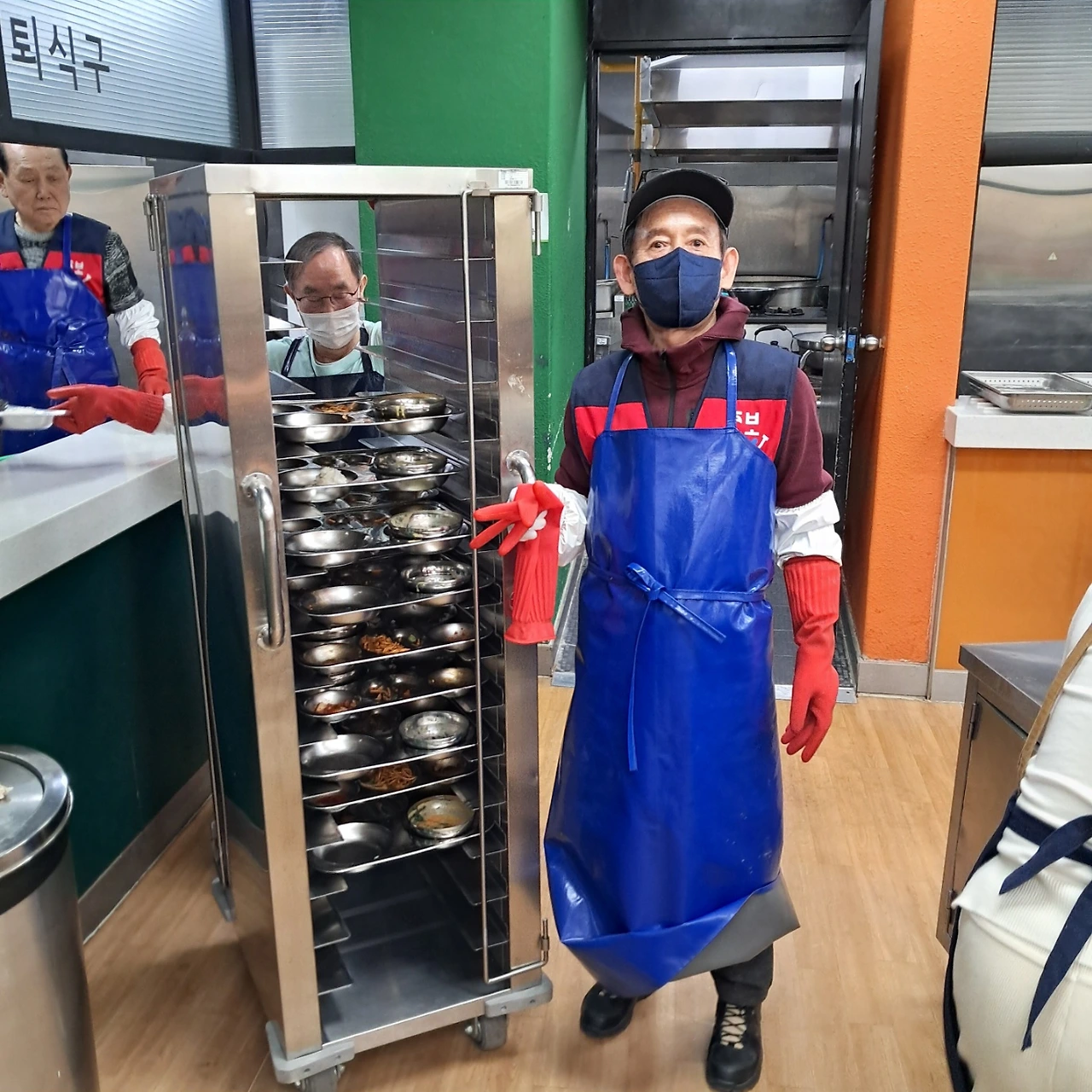 옮기는 역할을 맡았다. 식판을 트롤리에 넣고 이동시키는 일은 쉽지 않았다. 트롤리는 약 1.8m 높이로, 14칸에 2개씩의 식판을 넣으면 총무게가 200kg가 넘는다. 오늘은 힘 좋은 청년 봉사자가 없어, 건장해 보이는 내가 차출되었다.