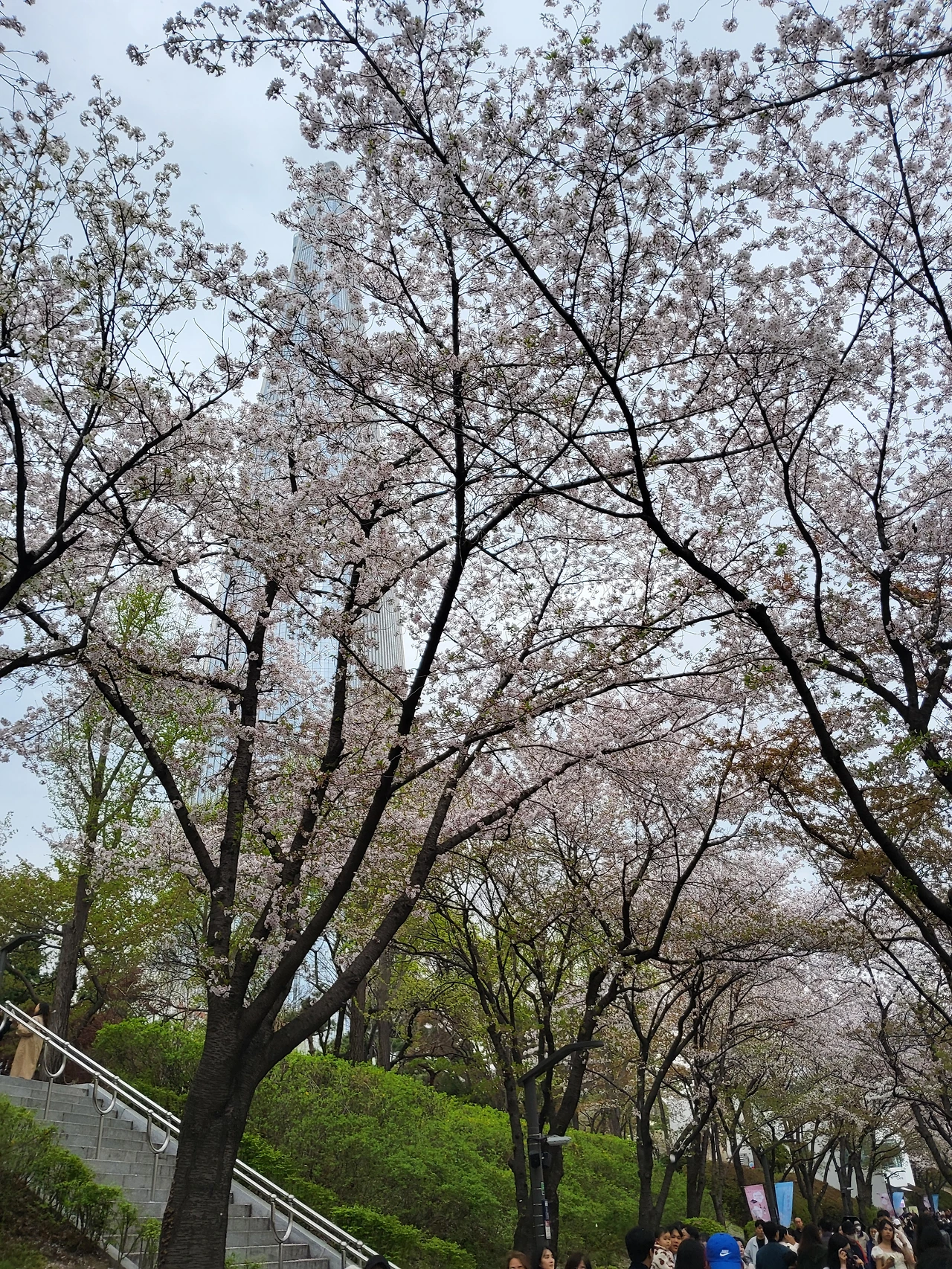 하늘을 찌를 듯 솟은 123층 롯데월드타워는 마치 호수 위에 떠 있는 듯한 인상을 준다. 유리창은 태양빛을 받아 눈부시게 빛난다. 만개한 벚꽃길은 발 디딜 틈 없이 북적이고, 곳곳에서는 거리 공연과 버스킹이 열려 발걸음을 사로잡는다.