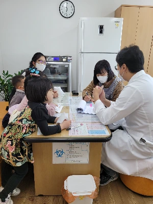 검진후 유치원생들에게 설명하는 모습
