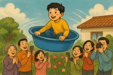나는 대야 요정을 타고 슝슝 날아다니고 친척들은 사진 찍느라 바빴어요.