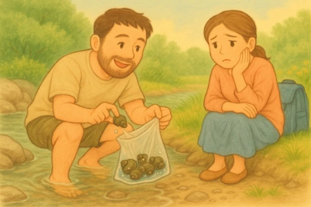 하지만 아저씨는 아줌마의 말을 듣지 않고 다슬기를 더 잡았어요.