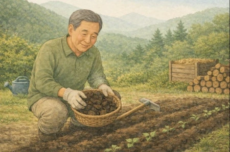 부엽토를 긁어모아 밭에 뿌리면서 땅심 돋우기와