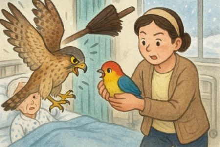 아줌마는 기다란 빗자루로 황조롱이를 퍽! 쳤어요.