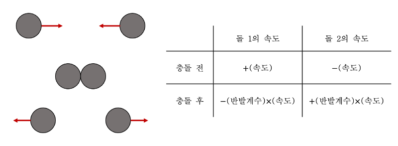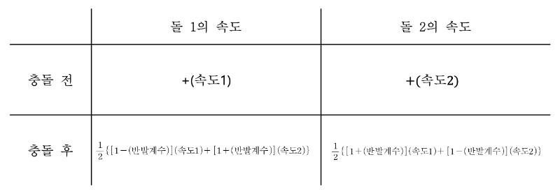 대칭적으로 운동하는 두 돌 각각의 충돌 전후 속도는 아래와 같다.