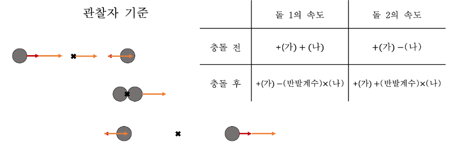 정지한 돌과 이를 향해 운동하던 돌이 충돌하는 상황에서 각각의 속도 변화를 구한 나는, 이제 두 돌이 각각 임의의 속도로 운동하다 충돌하는 상황에서 각각의 속도 변화를 계산하는 방법을 고민하기 시작했다.