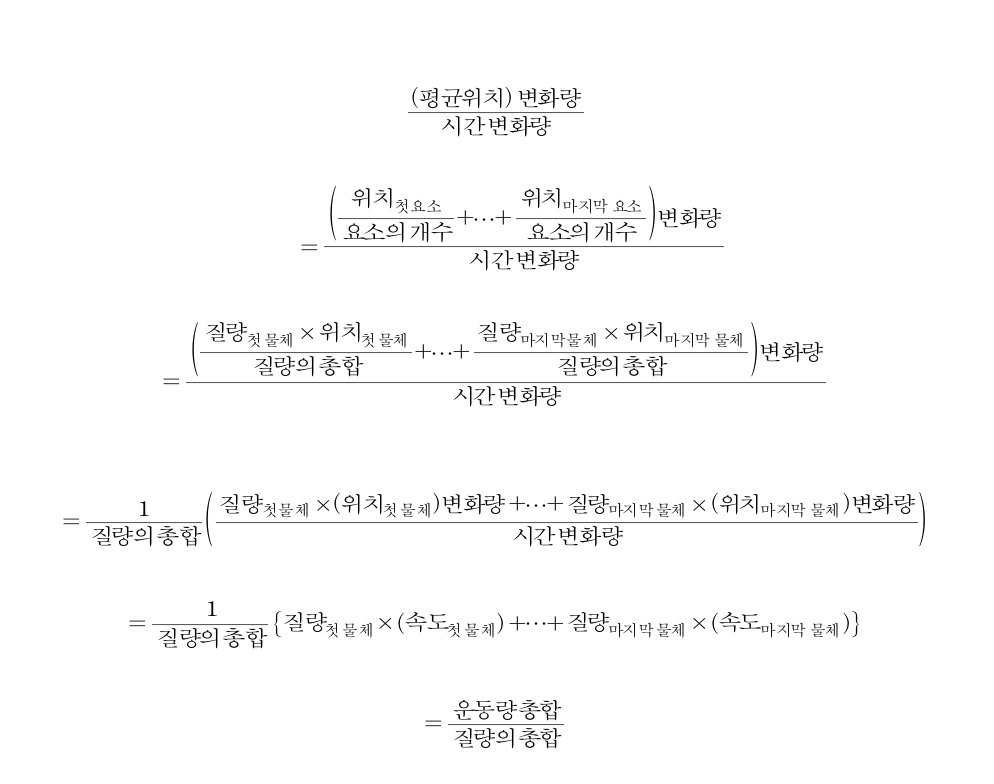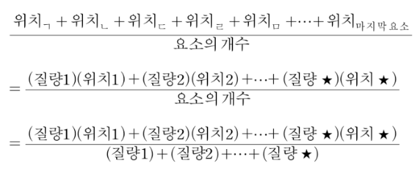 속도의 총합을 운동량의 총합으로 바꾼 것과 같은 방법으로, 각각의 단위 요소들의 평균 위치를 구하는 식에서 같은 물체를 이루는 요소들을 묶으면, 모든 요소의 평균 위치는 아래와 같이 표현된다. 그리고 나는 이를 질량 중심이라 부르기로 하였다.