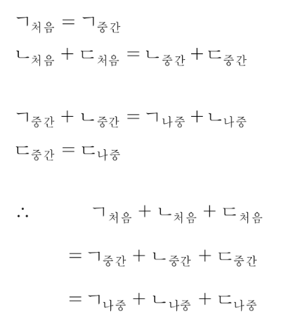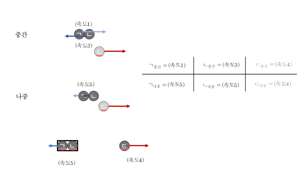 예컨대, 무게가 같은 세 요소 ㉠, ㉡, ㉢이 충돌할 때, ㉠과 ㉡의 속도가 충돌 전후에 동일하다고 하자. 즉, 세 요소가 충돌하는 찰나의 과정에서, 순간적으로 함께 움직이는 ㉠과 ㉡ 중 ㉡이 먼저 ㉢과 충돌한다. 그리고 다음 순간, ㉠과 ㉡이 충돌한 결과, ㉠과 ㉡의 속도가 다시 같아진다고 하자.