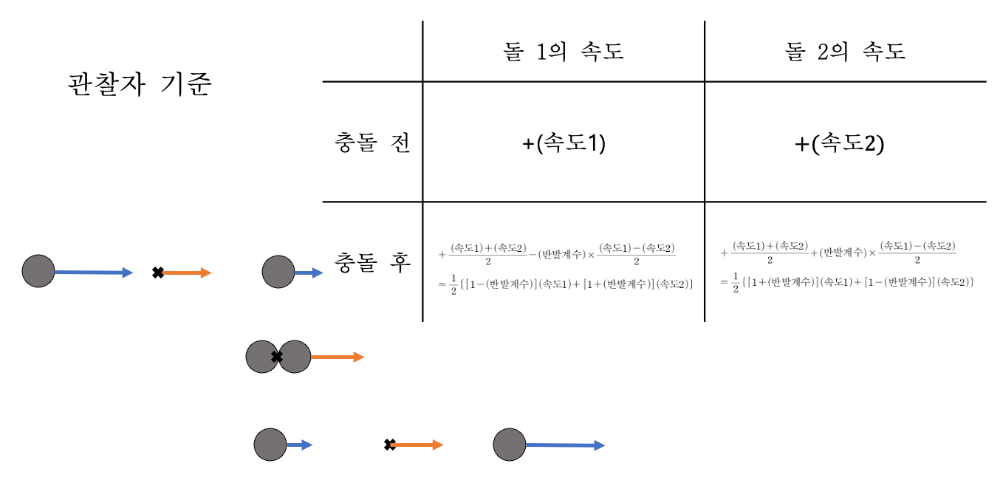 수식을 관찰해 보면, 똑같은 두 돌의 충돌 전후로 평균 속도, 즉 둘의 중점이 운동하는 속도가 보존됨을 알 수 있으며, 수식을 정리하면 아래와 같다.