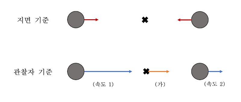 상대속도와 음수를 이해한 뒤, 나는 다시 원래 사유의 흐름으로 돌아왔다. 평평한 바닥 위에서 같은 속력으로 서로를 향해 움직이던 두 돌이 충돌하는 장면은, 지면에 선 관찰자에게는 완벽히 대칭적인 모습이다. 하지만 이 장면을 일정한 속도로 움직이는 관찰자가 본다면, 돌의 운동은 더 이상 대칭적으로 보이지 않는다.