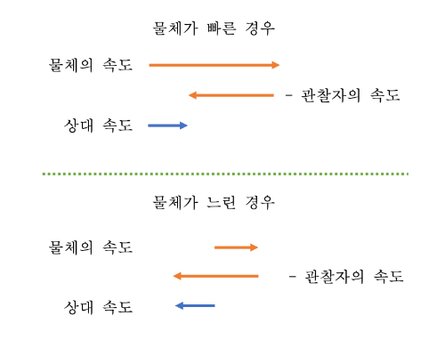 그리고 관찰자보다 느린 속력으로 앞으로 나아가는 물체가 존재한다면, 그 물체는, 관찰자를 기준으로, 뒤로 운동하는 것과 같이 관찰된다. 그리고 그 속도는 관찰자와 물체의 속도 차이와 크기가 같다.