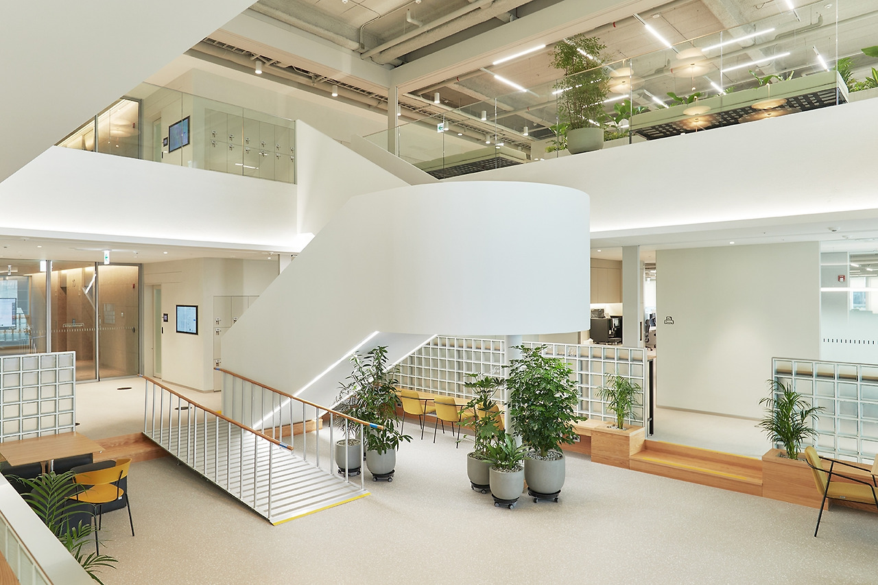 현대캐피탈 신사옥의 철학은 무엇보다 자율적인 소통과 협력에 있습니다. 이를 위해 CEO 집무공간을 중층에 배치하고 과감히 중앙 계단과 오픈라운지를 설치하는 등 권위를 허물기도 했습니다. 또 쾌적한 전망을 자랑하는 최상층 공간은 직원들을 위한 휴식, 상담, 힐링 공간으로 할애해 직원들의 마인드 케어와 함께 자율성을 높이는 방식으로 진화할 수 있었죠.