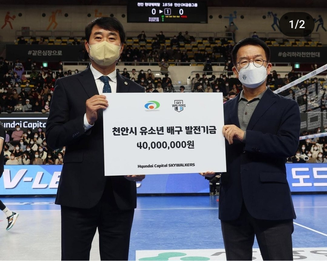 또한 전통의 명가 현대캐피탈 배구단은 팀의 우수한 성적뿐만 아니라 배구라는 스포츠의 발전을 위해 노력하고 있습니다. 현대캐피탈 배구단의 연고지인 천안시의 유소년 배구발전을 위해 매년 유소년 배구발전기금을 지급하고 있죠. 선정된 학교에 기부금을 직접 전달하는 방식이며 지난 22년에는 천안시 내 8개 학교가 선정되어 기부금이 지급되었습니다.