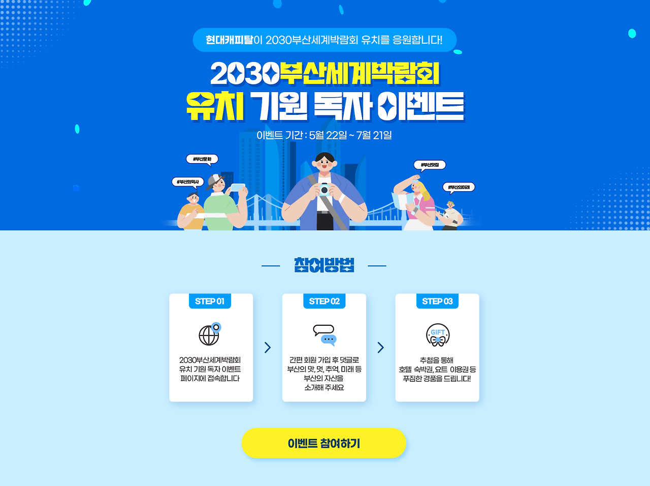 현대캐피탈은 2030 부산 세계박람회를 위해 지난 7월 부산의 대표 지역언론인 부산일보와 함께 2030부산세계박람회(이하 세계박람회) 유치 기원이벤트를 개최했습니다. 시민들이 부산의 자랑거리 소개와 비전을 직접 제안하는 이벤트를 마련해 세계박람회에 대한 관심도를 끌어 올리는데 힘썼죠. 또한 현대캐피탈 부산 사옥에 세계박람회 유치를 기원하는 현수막을 설치했고 현대캐피탈 공식 앱에 세계박람회 유지를 기원하는 “배너“를 달아 세계박람회 홍보에 힘을 보탰습니다.