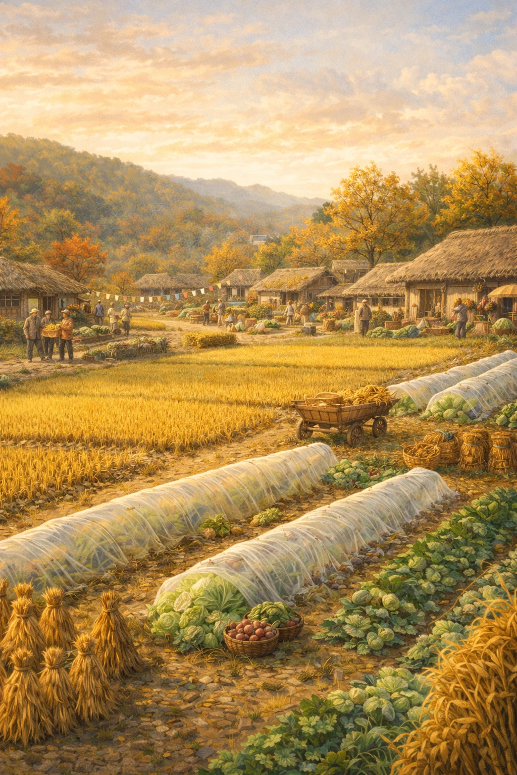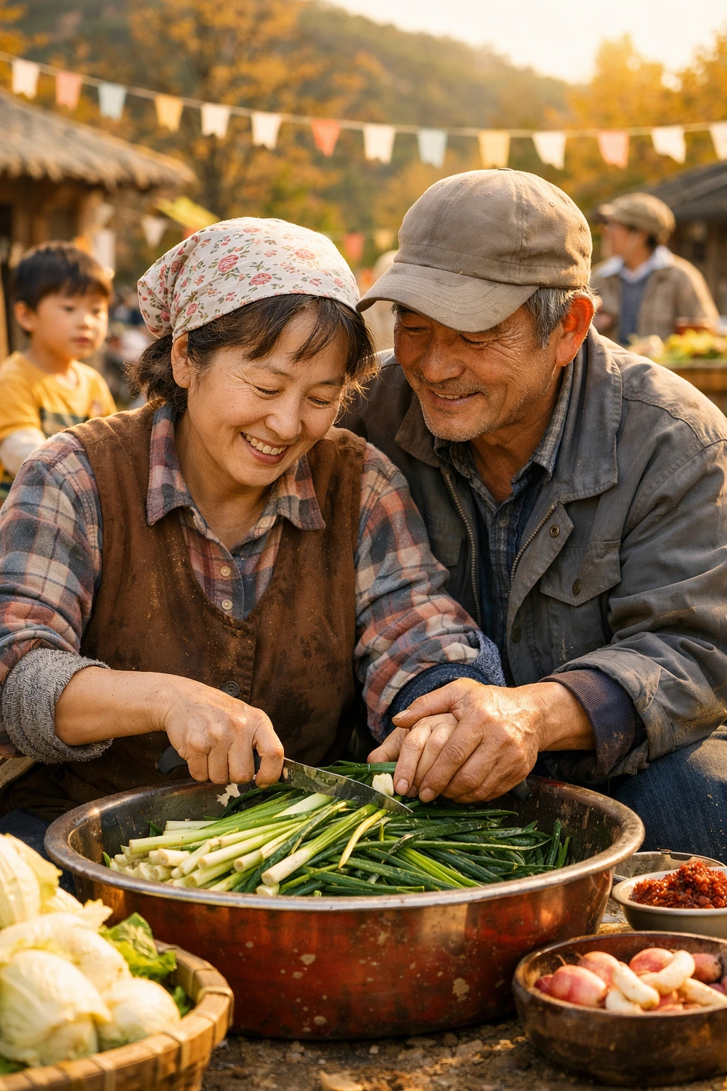 늦가울 어느 날, 마을에서는 작은 수확 축제가 열렸다. 사람들이 모여 각자의 농작물을 나누고, 손수 만든 음식을 판매하며 하루를 즐기는 날이었다. 아주머니는 바쁜 손놀림으로 축제 준비에 나섰다. 흙이 묻은 파를 다듬고, 열무와 총각김치를 담그는 일도, 남편의 손길을 받으며 척척 해냈다.