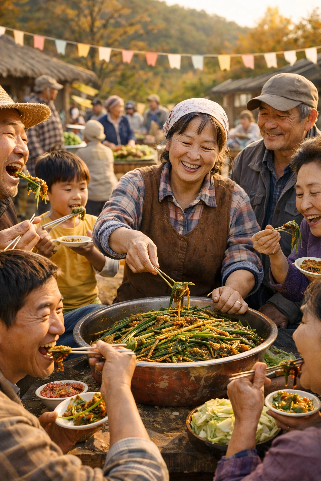남편은 그녀의 손을 꼭 잡고 미소 지었다. 그 모습을 보는 마을 사람들은 자연스레 서로를 배려하며 웃음을 나누었다. 아이들은 아주머니 곁에서 김치를 조금씩 맛보며, “우리도 나중에 이렇게 맛있는 걸 담글 수 있을까?” 하고 물었고, 아주머니는 손을 들어 아이들을 살짝 꼬집으며 웃었다.